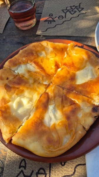 Wir genießen einen sonnigen Nachmittag im Restaurant Casa Maria by Asconi Winery mit Kompott - ein süßes, erfrischendes Fruchtgetränk, Plăcintă cu brânză – dünne mit Schafskäse in der Pfanne gebackene Teigfladen und das typische Maisgericht Mămăligă, ähnlich der Polenta.